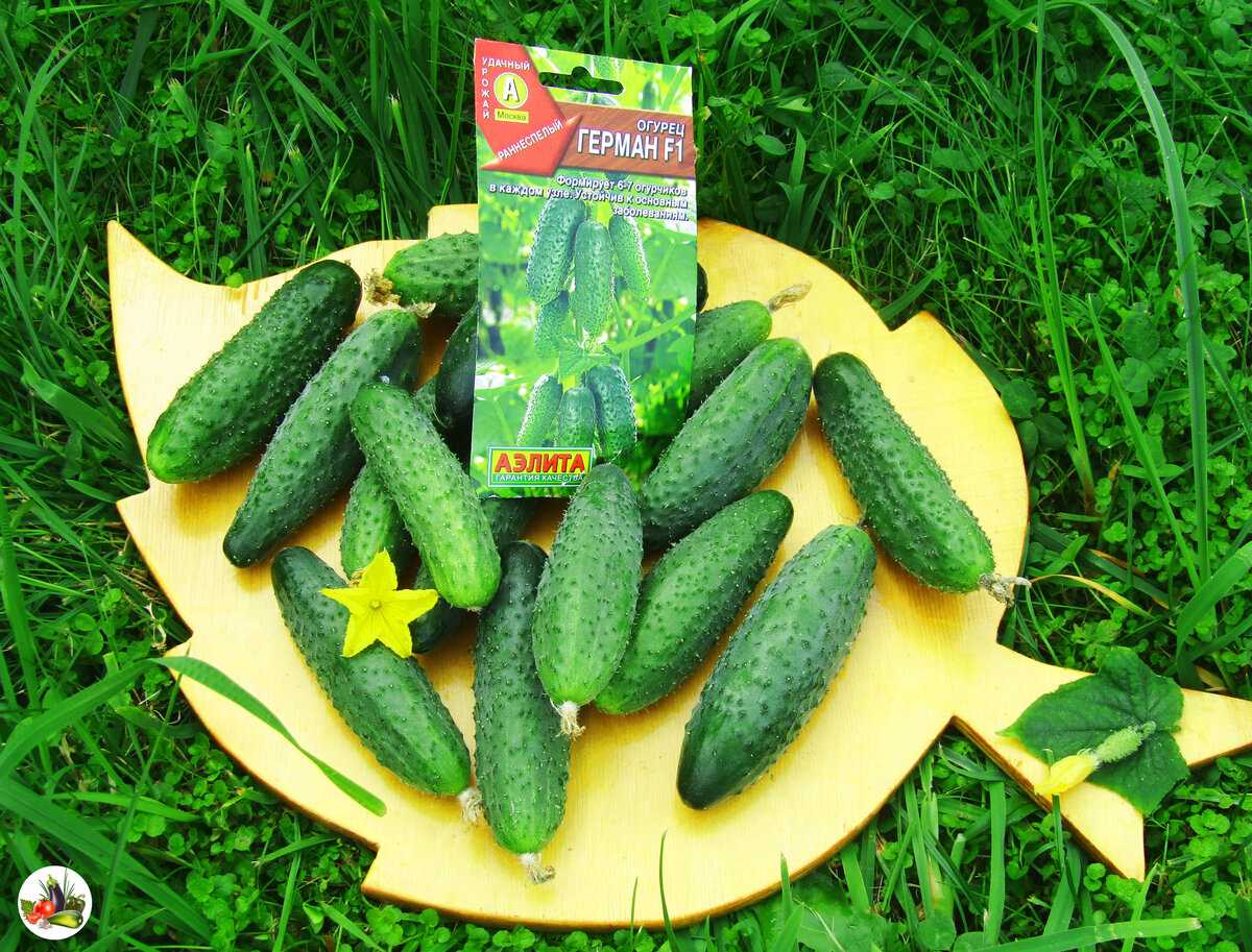Герман F1 – партенокарпический, высокоурожайный раннеспелый гибрид, устойчив к заболеваниям, плоды длиной до 10 сантиметров, пупырчатые без горечи.