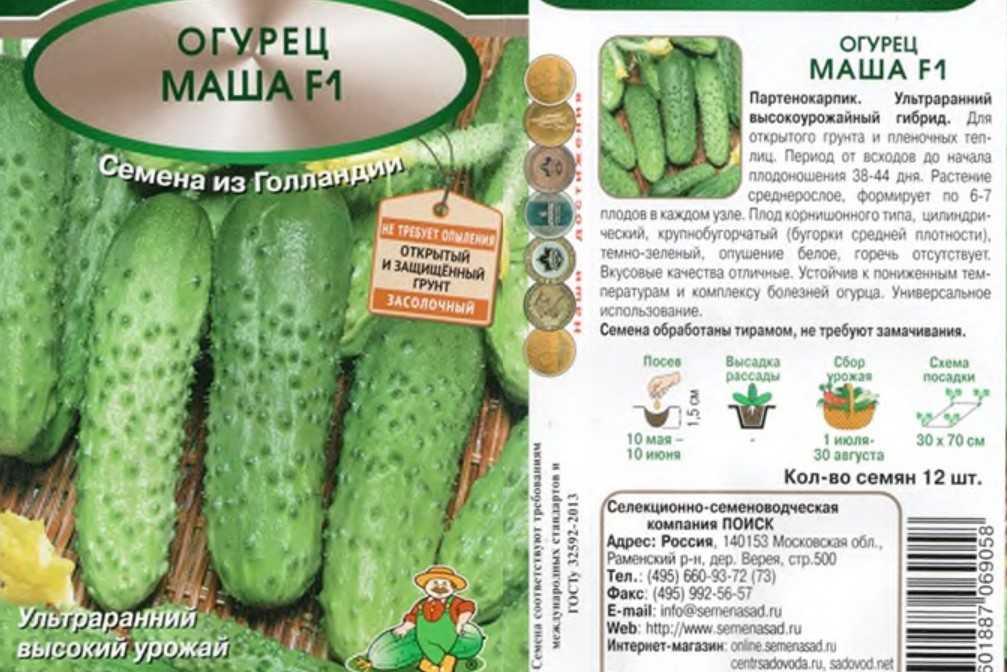 Маша F1 – партенокарпический гибрид, раннеспелый, мелкопупырчатый, плоды до 11 сантиметров, имеют сладковатый вкус, лишены горечи, хорош для консервации и употребления в свежем виде.