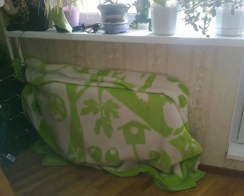 Отопительные чугунные батареи можно укутать постельным бельем, сложенным в несколько слоев. Элемент скрывают от подоконника до нижней линии, стараясь спрятать каждый сантиметр металла. Кроме основной излучающей поверхности обязательно маскируют трубы и общий стояк.