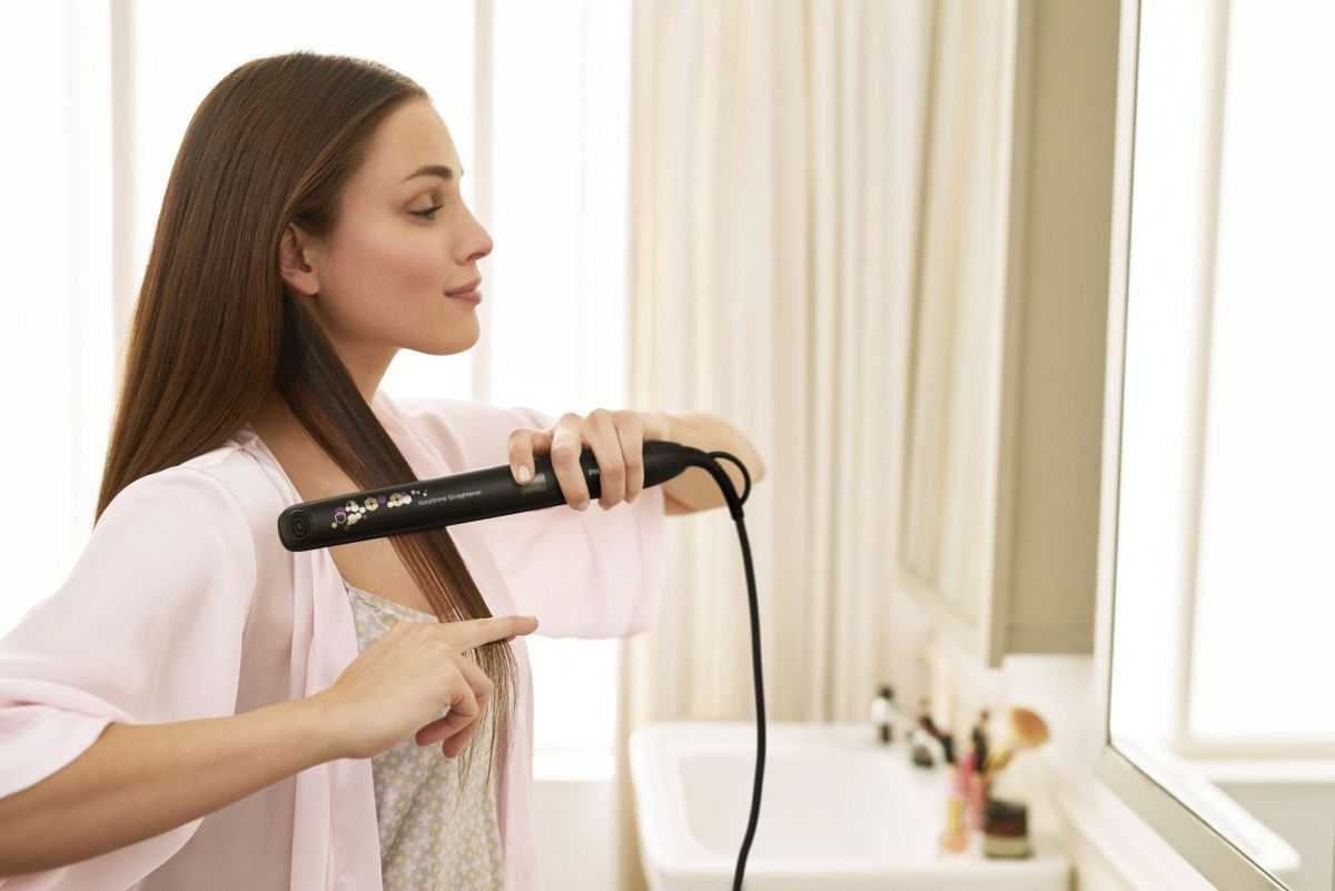 Например, выпрямитель с керамическими пластинами Philips StraightCare оснащен терморегулятором на 10 режимов работы — это позволит подобрать подходящую температуру для укладки конкретного типа волос и не повредить локоны.