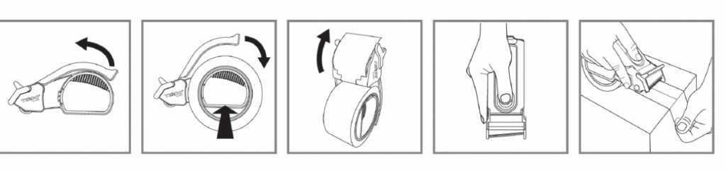 - Отрежьте ленту с помощью встроенного ножа, наклонив диспенсер.