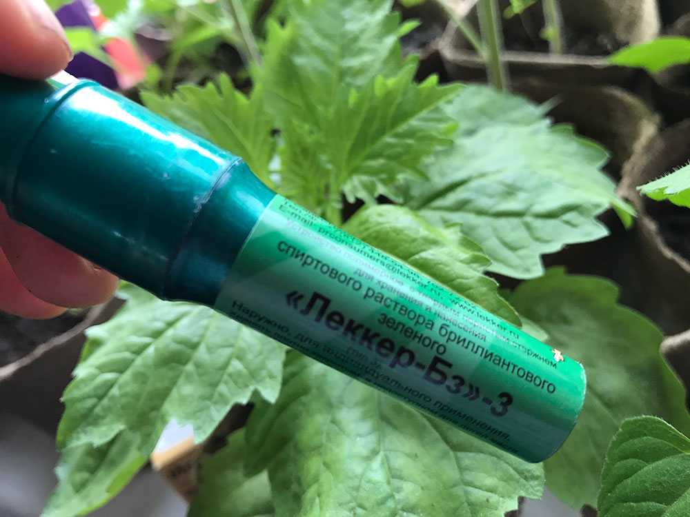 Перед посевом семена 30 минут обеззараживают в растворе зеленки: вода (100 мл) + вещество (1 ч.л.).