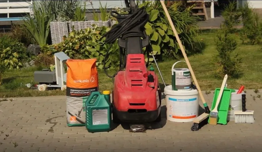 Важно не только моющее средство, но и применяемые инструменты. Качественный результат даёт минимойка, но она вряд ли спонтанно имеется, являясь профессиональным инструментом. В ход идут разнотипные подручные средства, включая скребки, традиционные щётки, зубила, садовые шланги, проволочные щётки, наждачную бумагу и так далее