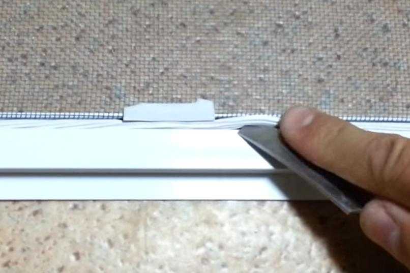 После этого подтягивается полотно, уплотнительный шнур помещается на прежнее место, запрессовывается ножницами или строительным ножом.