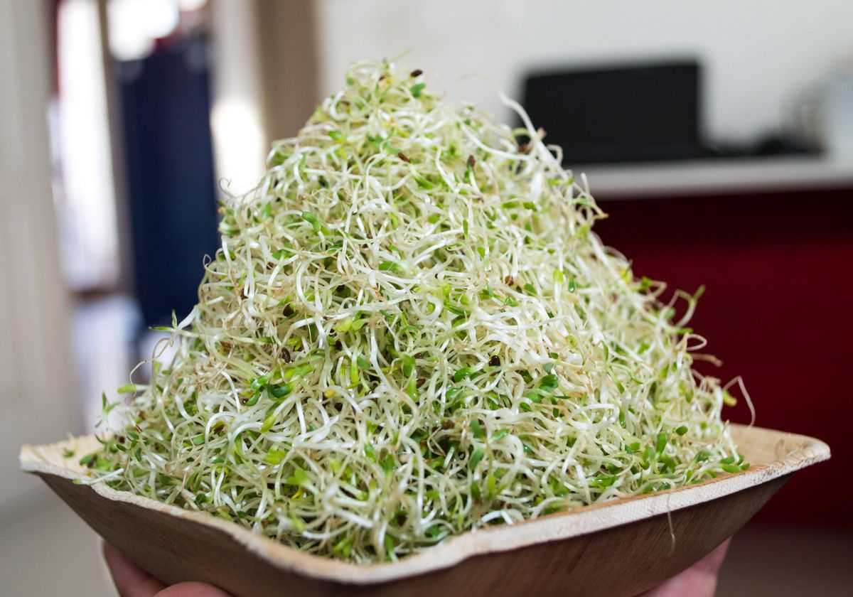 В домашних условиях люцерну можно прорастить даже без грунта. Это делают для употребления растения в лечебных целях, а также в гастрономических. Полезные и питательные ростки проращиваются из семян травы. Они имеют приятный укус, напоминающий зеленый горошек.
