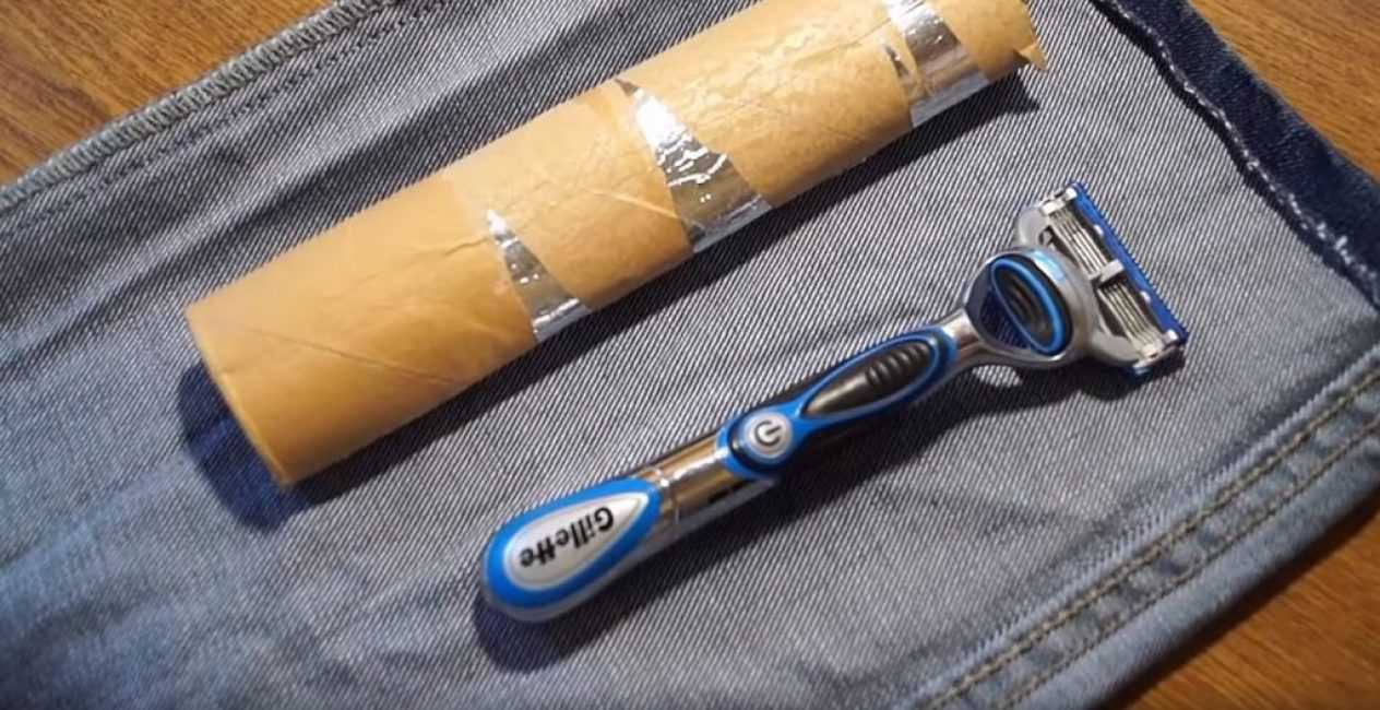 Чтобы заточить лезвие, понадобится собственно джинсы, круглый и продолговатый предмет, но немного мягкий. То есть это может быть бумажное или пластиковое изделие – бутылка из-под воды, рулон туалетной бумаги, или картонная трубка, на которую наматывается фольга или пергамент.