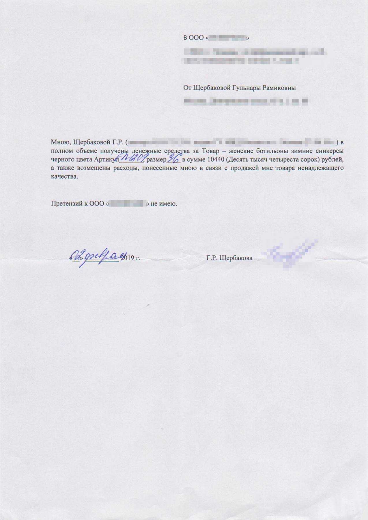 В итоге я получила 10 440 Р — это стоимость ботинок на момент покупки — и 15 000 Р в виде трех сертификатов, которые могу потратить в любое время. Чтобы закрыть вопрос, я подписала документ о том, что претензий к магазину больше не имею.