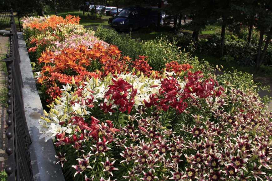 Чтобы создать цветник надо грамотно использовать лилии в ландшафтном дизайне. Высокорослые виды хорошо смотрятся на заднем плане, а низкорослые (0,5 м) подходят для бордюрного озеленения.