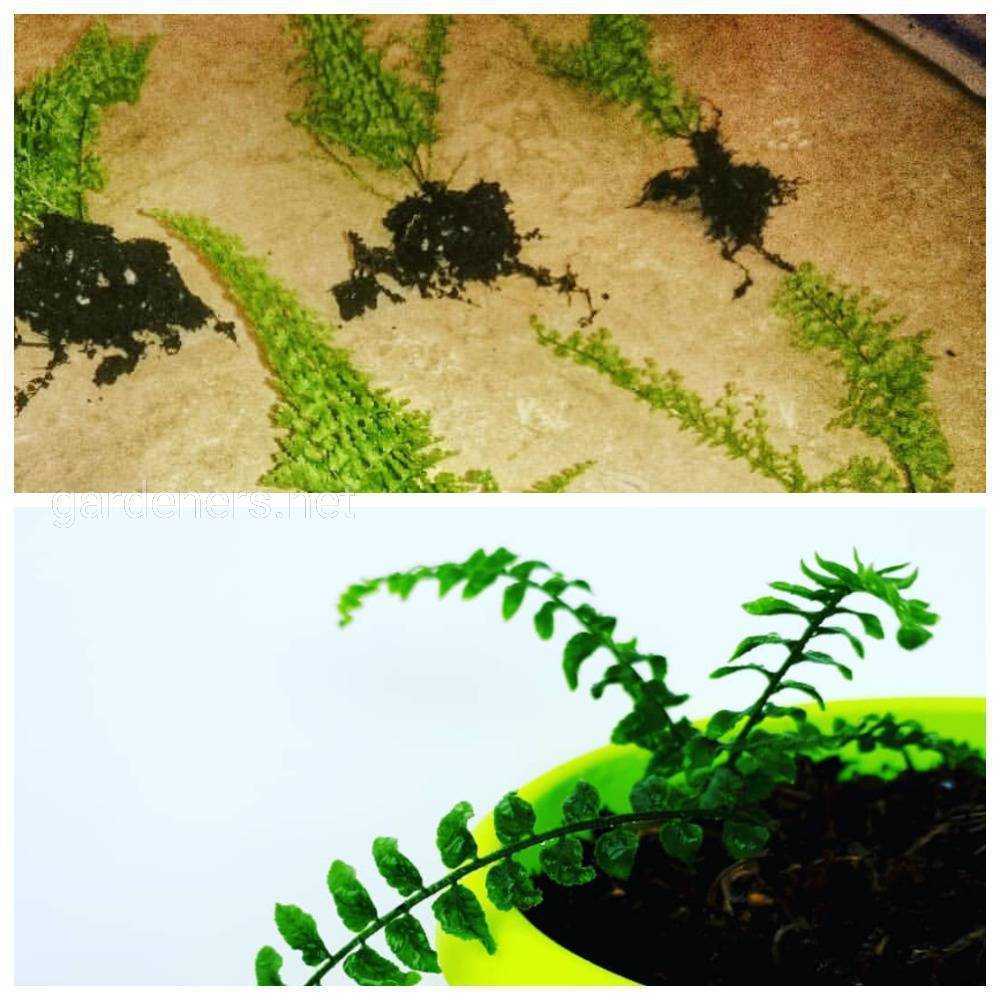 В процессе укоренения, почву следует держать всегда влажной. Спустя две недели появится новый отросток, а когда он начнет расти и окрепнет, его можно отделить от взрослого папоротника, отрезав ус у грунта, присыпав срез толченым древесным углем и высадив его на постоянное место роста.