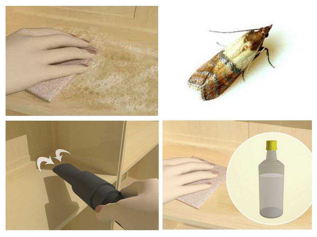 Если у вас появилась пищевая моль, и вы задаётесь вопросом, как вывести вредителя окончательно, чтобы он не появился через неделю или месяц, выбрасыванием очагов заражения проблема не будет решена. Нужно провести тщательную уборку кухонного помещения. Для этого освободите все шкафчики, откройте их нараспашку и вымойте каждый уголок концентрированным мыльным раствором. Пищевая моль не любит света, ей не нравится мыло. Напоследок хорошенько протрите все поверхности уксусным раствором и проветрите кухню.