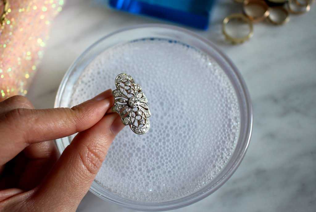 Изделие закладывают в него и потряхивают. После этого бижутерию споласкивают проточной водой и вытирают. Также ее можно чистить в воде с порошком или в воде с жидким мылом. При полоскании некоторые добавляют пару капель нашатырного спирта.
