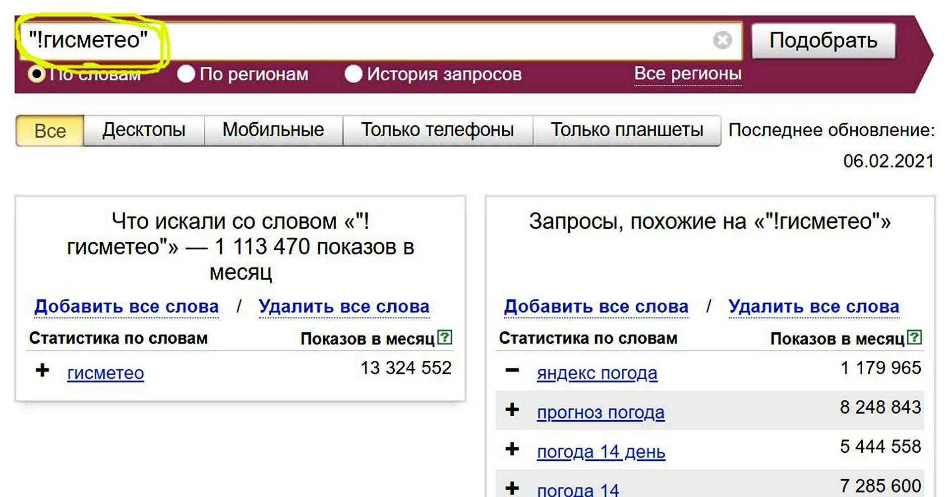 Чтобы точно узнать сколько раз спрашивали этот зарос в точном виде, набирать его надо в кавычках и восклицательным знаком, например: «!гисметео» или «!яндекс !погода»