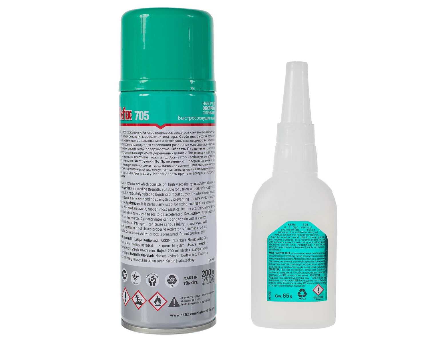 Akfix 705 клей для экспресс—активации продается в упаковке, включающей два компонента: 50-миллиметровый флакон с клеевым раствором и 200-миллиметровый аэрозоль активатор.