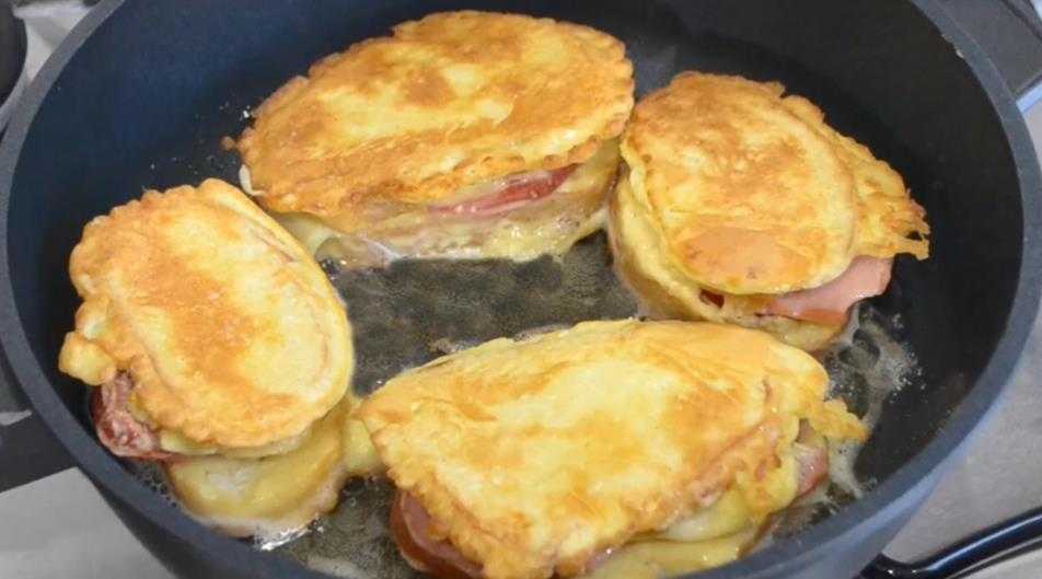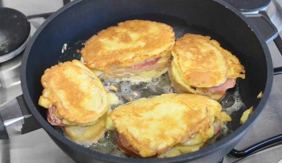 Горячие бутерброды на сковороде с колбасой, сыром и яйцом