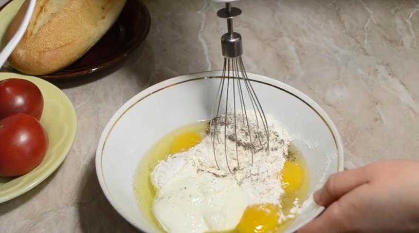 Соединить яйца с майонезом и сметаной. Добавить в кляр муку, посолить, поперчить и взбить миксером.