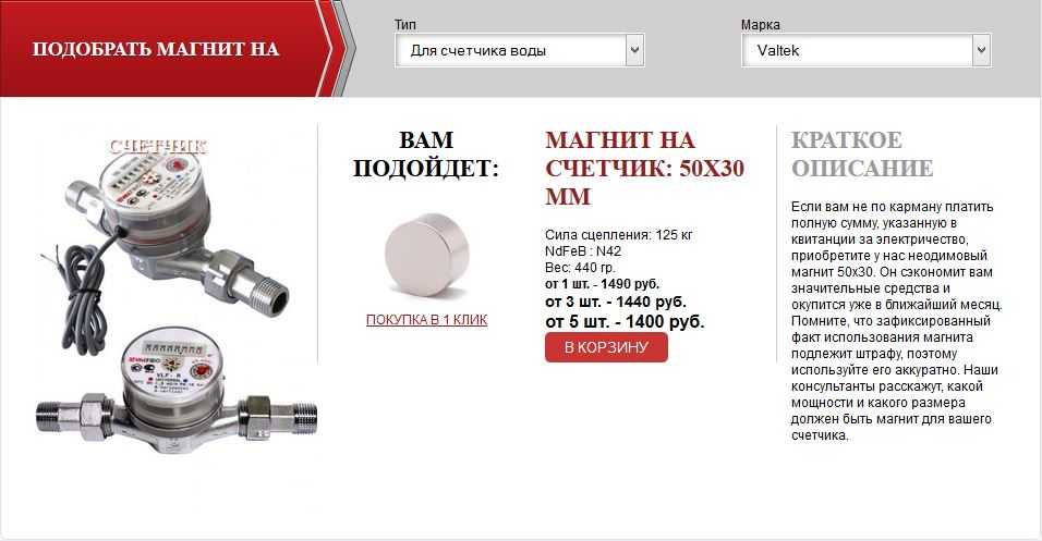 Большинство водяных счетчиков оснащены магнитной муфтой, это свидетельствует о том, что счетный механизм передает импульсы на крыльчатку посредством магнитных волн. Если к устройству поднести сильный магнит размерами, например, 25*45, 30*45, 25*55, он будет сдерживать (притягивать) магниты, установленные в самом устройстве. В результате – показания водосчетчика не соответствуют реальным цифрам. Используя этот подход, люди осознанно останавливают большое количество моделей водосчетчиков.