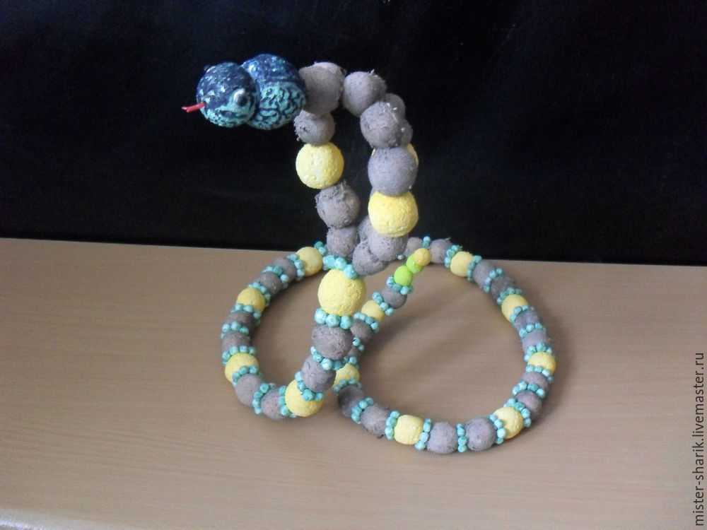 Змейка. Основа – стальная проволока толщиной 1.5 -2 мм. Проволоку (без шариков) загибаем в виде змейки, чтобы она устойчиво стояла на плоскости. Затем нанизываем шарики на проволоку.