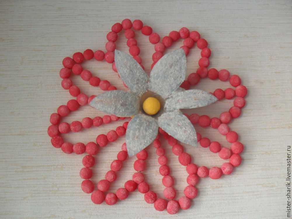 Розетка. Основа – игольница от булавок с шариками. Лепестки сделаны из тонкой стальной проволоки толщиной 1 – 1.5 мм, с нанизанными пенопластовыми шариками.