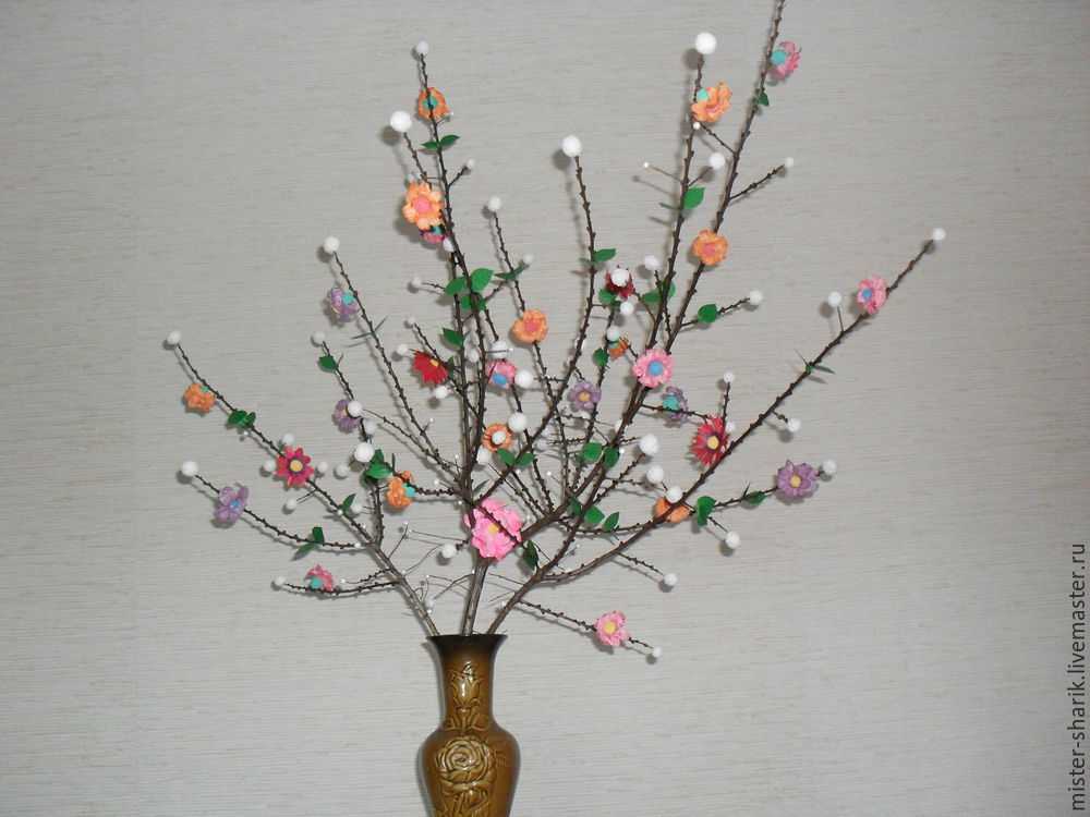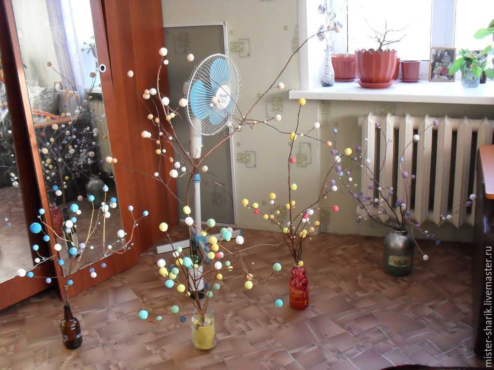 Ветка для декора. Шарики насаживаем на иголки ветки облепихи и дополняем цветами из цветной бумаги.
