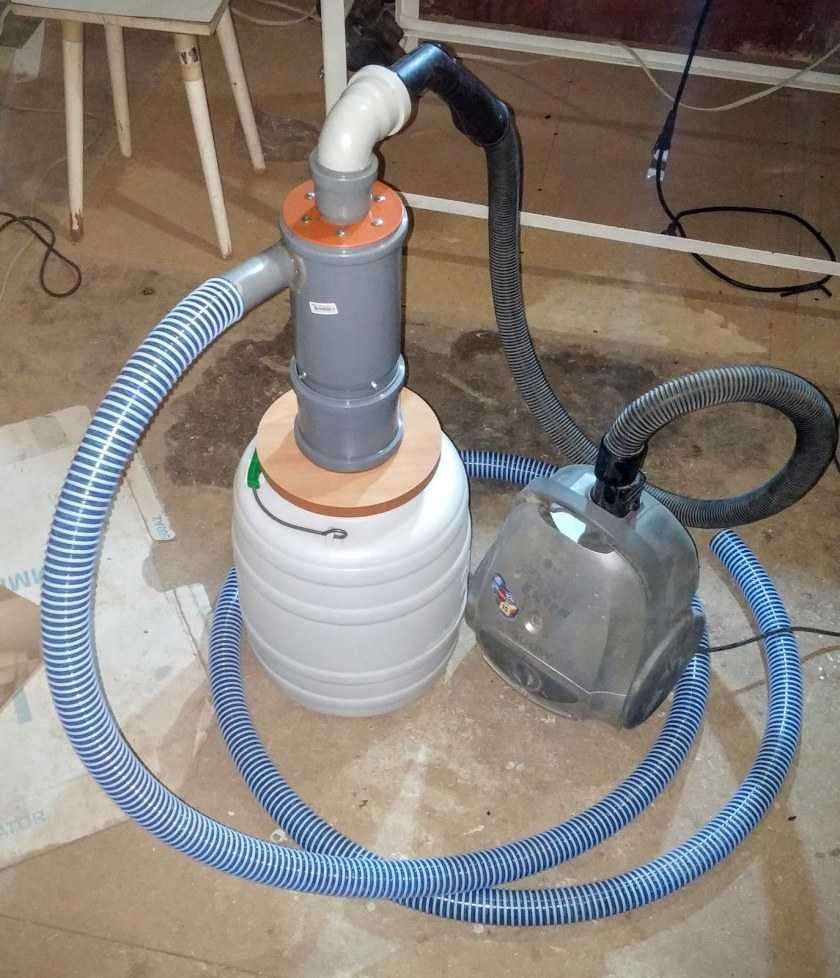 На крышку емкости устанавливается мотор от пылесоса с помпой и выключателем. Одно из отверстий соединяется с помпой посредством гофрированного шланга.