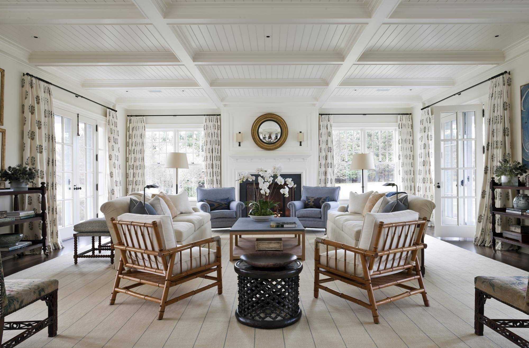 Мебель обычно делают из дерева, можно выбирать и плетеные элементы, например, кресло-качалку или тот же журнальный стол. Нередко можно встретить у стены камин, тогда диван обязательно будет повернут к нему.