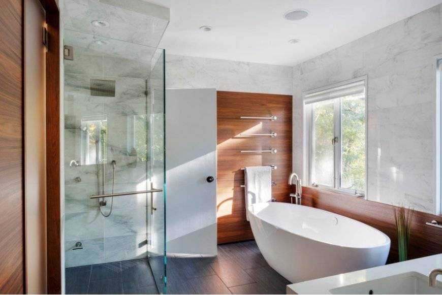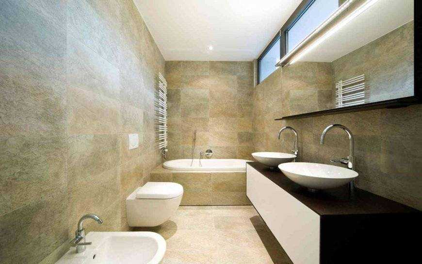Дизайн ванной комнаты должен быть выполнен в нейтральных тонах с использованием простых линий и форм. Для отделки пола и стен применяется керамическая плитка, имитирующая дерево или солому. Плитку на стенах можно заменить декором, бордюром или панно.