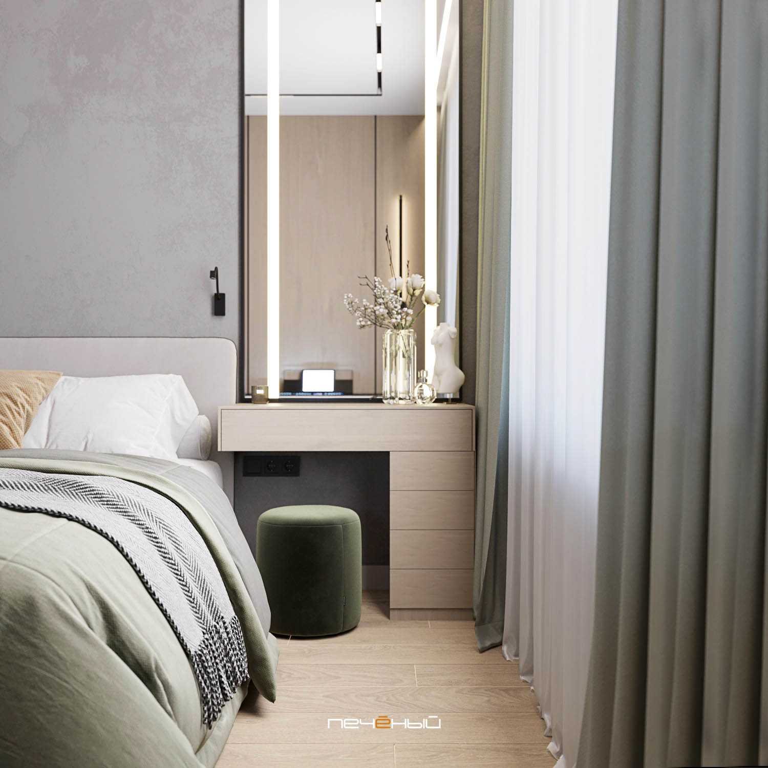 Здесь использовали такой брутальный приём, как «стены под бетон», тем не менее, эта спальня вовсе не смотрится чисто мужской. А ещё в этом интерьере удалось почти спрятать огромный шкаф, благодаря тому, что его фасады почти полностью сливаются с цветом стен.