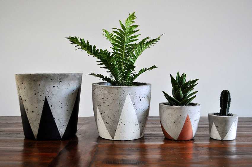 Вещь обрабатывают цементным раствором, чтобы добиться долговечности, устойчивости и «эффекта старения». Растение размещают в соответствующем горшочке.
