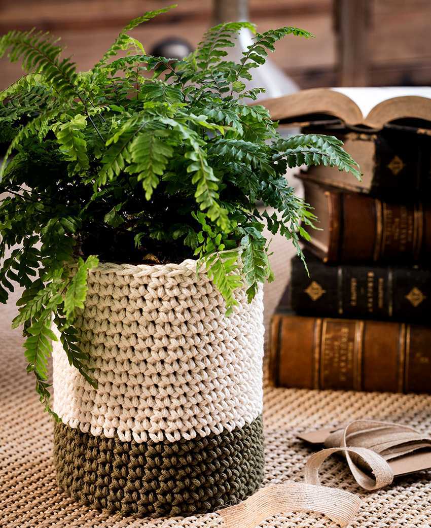 Очаровательное кашпо легко сделать с помощью пряжи, спиц или крючка. Крупная плотная вязка поможет скрыть все потертости старого горшка, а использование крючка создаст невероятно легкие и изящные рисунки.