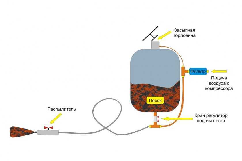Самодельный вариант делается на основе типовых схем, которые могут отличаться друг от друга лишь методикой подачи песка на очищаемую деталь. Но какими бы не были схемы (чертёж) устройства, все они будут включать следующие элементы: