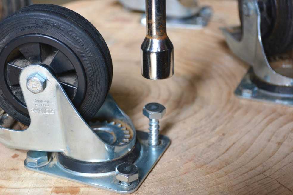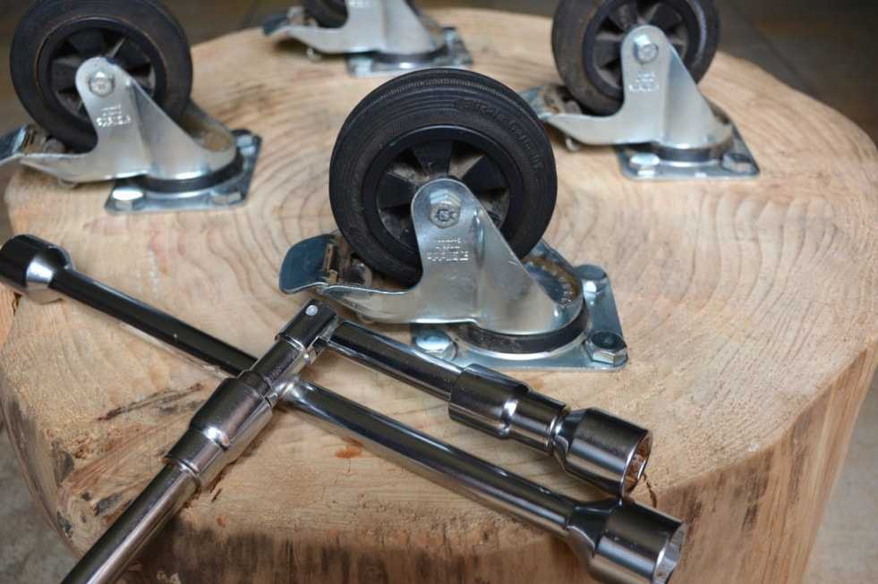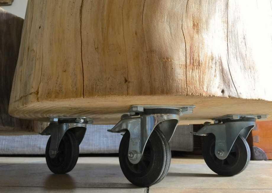 - Удобным решением будет использование мебельных колёсиков в качестве ножек. Стол из поддонов получается тяжёлым, а такая конструкция позволит легко передвинуть его. Колёсики должны иметь высокую грузоподъёмность и тормоза.