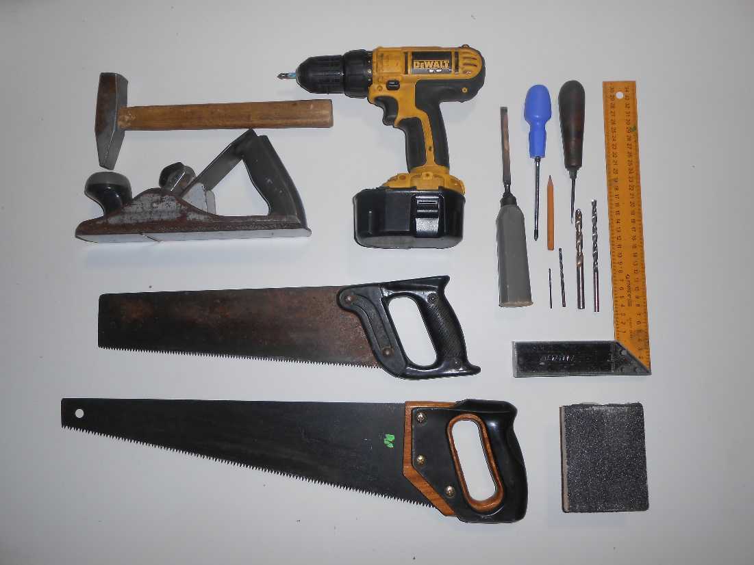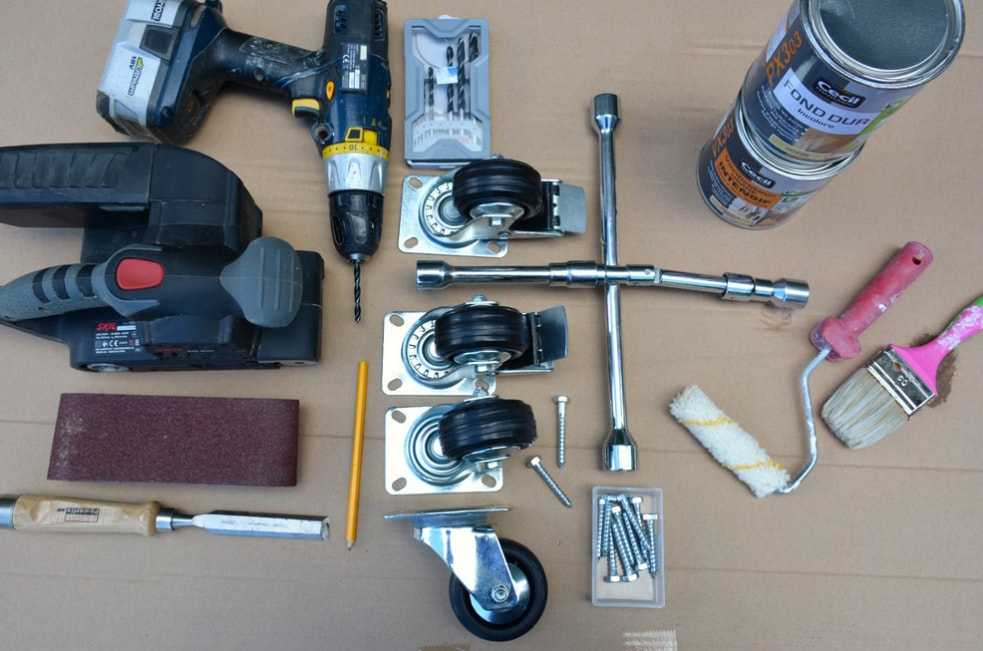 Вторым этапом подготовки является выбор инструментов. Их набор зависит от материалов, которые будут использованы, но существует некоторый стандартный комплект: электролобзик, дрель, шуруповерт, пила, ножовка, струбцина, несколько видов отверток, молоток, уровень, линейка. В процессе могут понадобиться и другие приспособления, к этому нужно быть готовым. Например, при выборе стеклянной столешницы еще понадобится стеклорез. Также нужно приготовить все необходимое для отделки (ткань, краску, клей или другое).