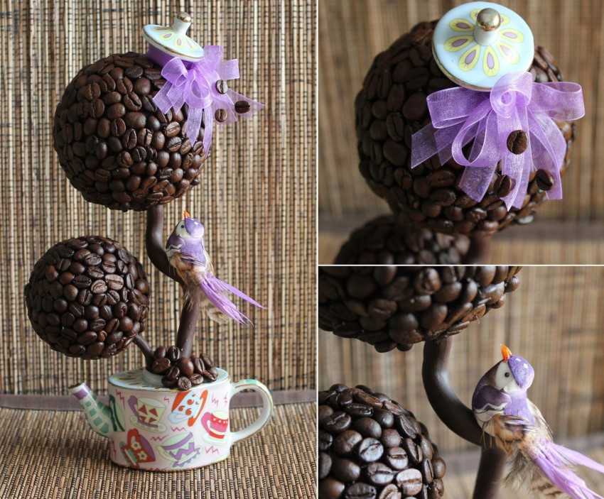 Еще один актуальный декоративный экспонат из зерен – деревца, или еще как называются, топиарии. В сети много видео мастер-классов, раскрывающих тонкости конструирования украшений интерьера, но именно дерево с листвой из мокко отличается элегантностью.