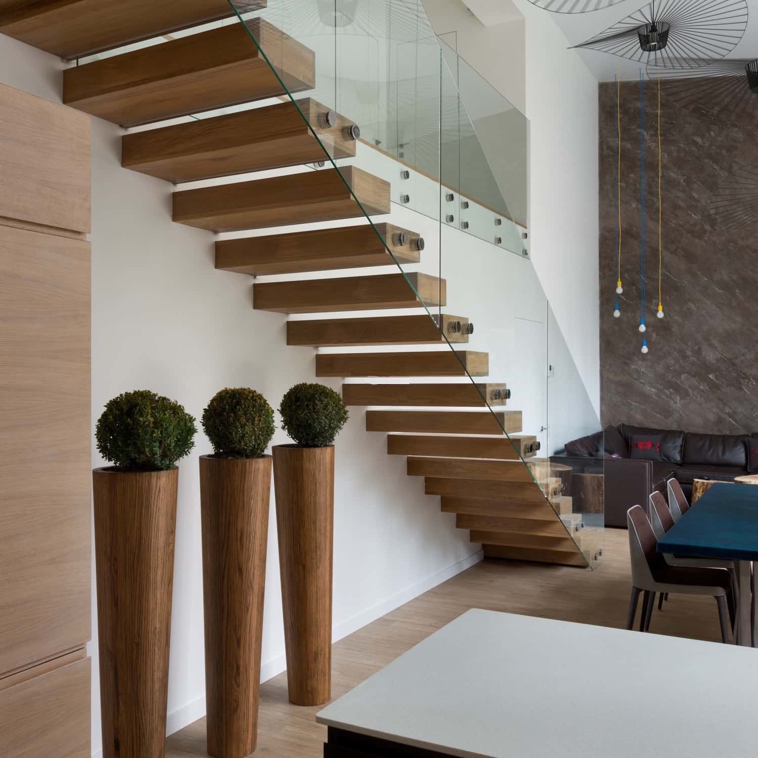 Средства выразительности сведены к минимуму: фактура материала, плавность линий, естественная цветовая гамма. Отличное решение — ступени на больцах.