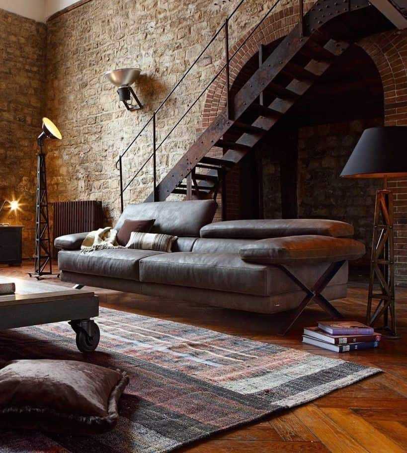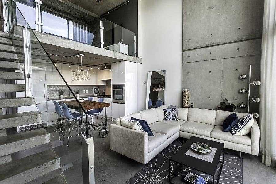 Бетонная или металическая лестница безупречно впишется в стиль лофт. Такие конструкции не требуют дополнительного декорирования, для них хорошим соседством станет кирпичная кладка на стене. Неплохо будут смотреться и другие материалы при условии, если отдать предпочтение предельно простым формам. Но не забывайте, важным критерием служит комфортное безопасное передвижение.