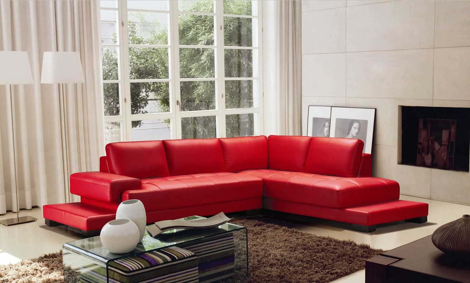 Красный угловой диван с кожаной обивкой – крайне сложный элемент. Сам материал трудно правильно обыграть
