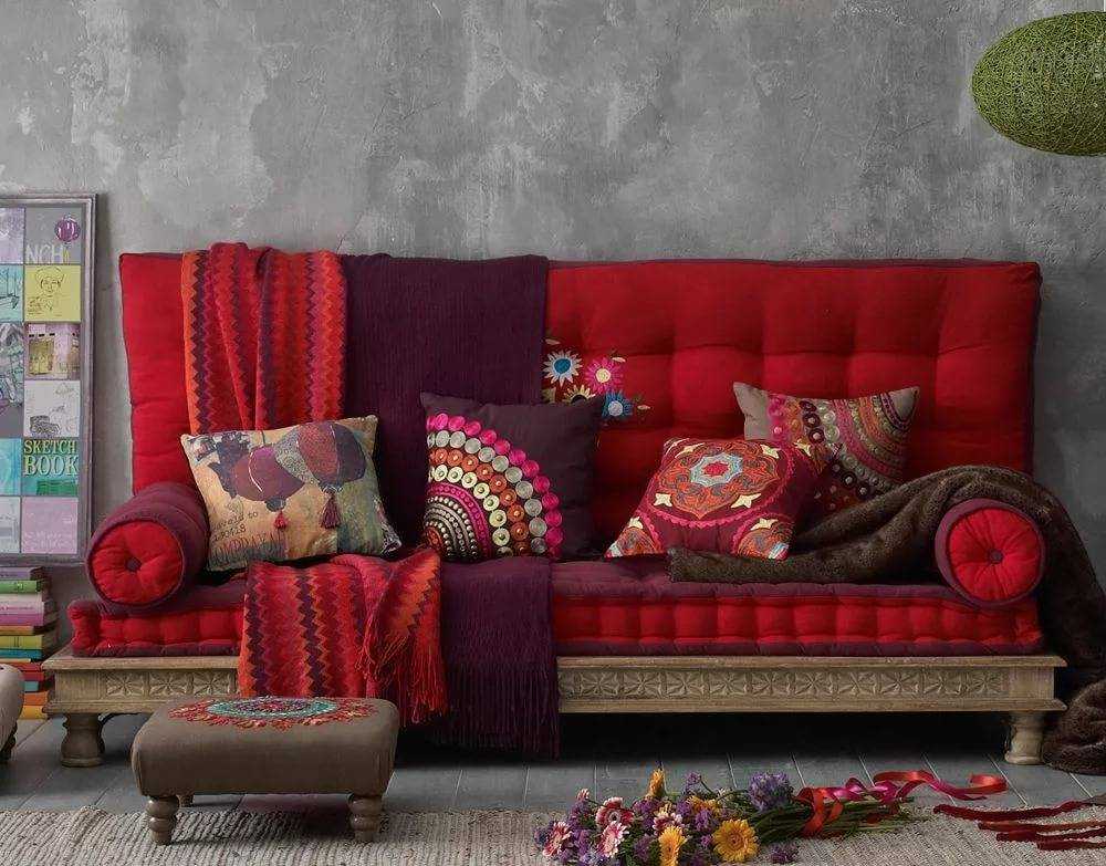 Красный диван обозначит зону отдыха в гостиной. Подушки и покрывала, перекликающиеся с другими оттенками, свяжут интерьер воедино.