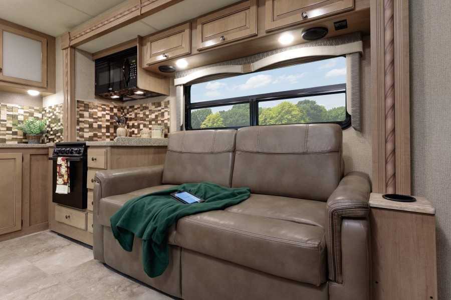 Функциональное оформление создаст дополнительное полезное пространство. Столик может располагаться на подлокотнике или по всей окружности дивана.