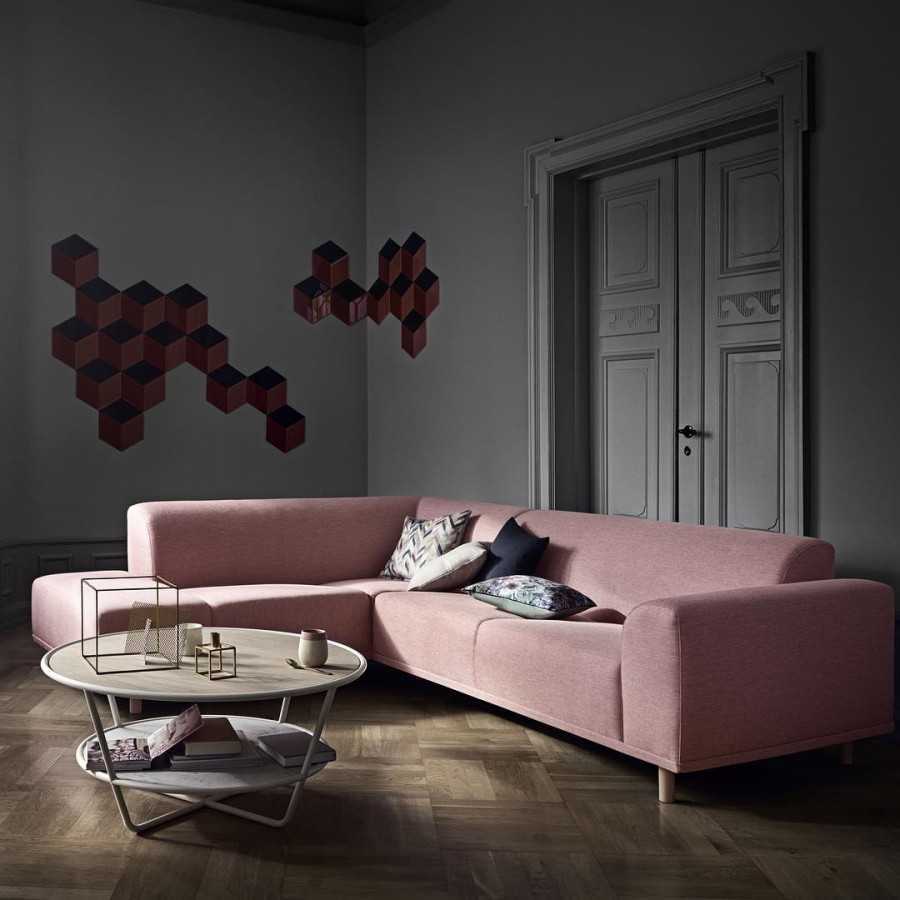 Диван с невысокой спинкой или угловой также можно поставить посреди комнаты, правильно распределив соотношение стен и мебели. Перед ним поставьте журнальный столик.