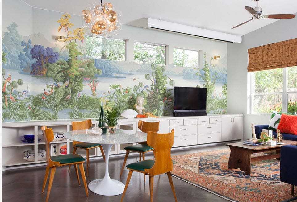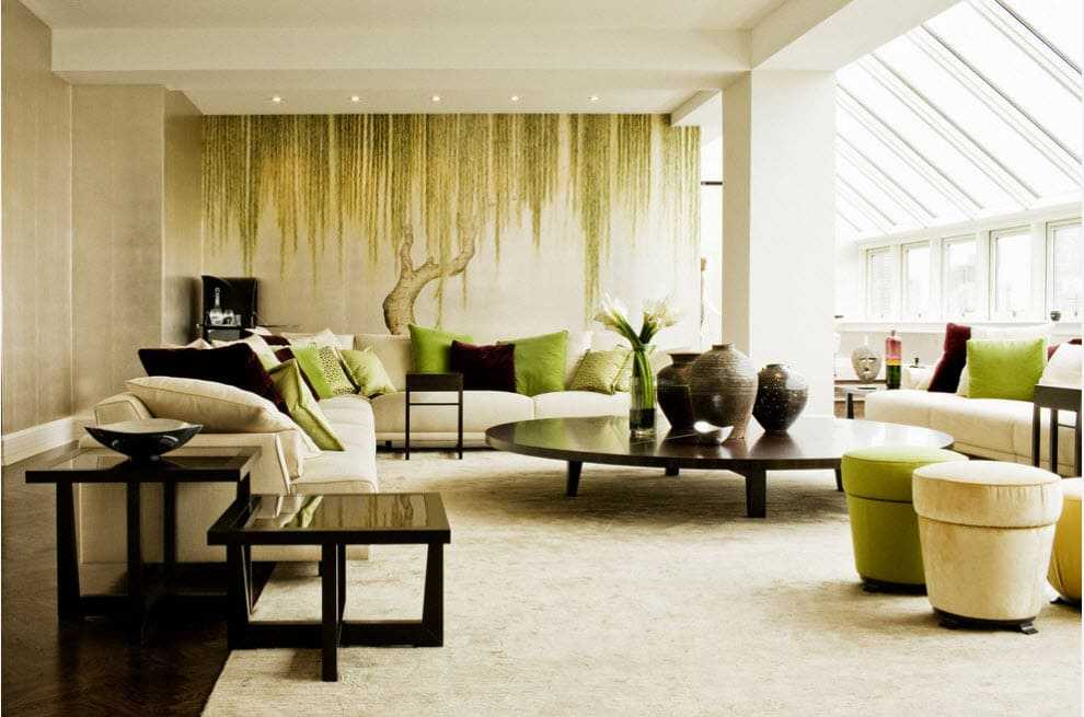 Желательно, чтобы настенный рисунок перекликался с какими-либо элементами интерьера, например, с подушками на диване, картиной на одной из стен, ковром, шторами или скатертью.