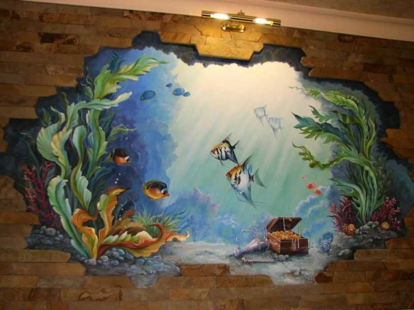 Рисунки 3д популярные в уличной живописи, постепенно осваиваются и в оформлении внутренних стен.