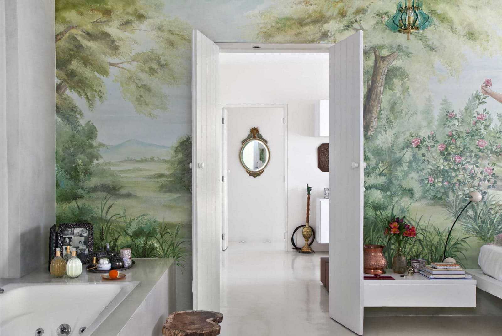 Небольшие рисунки с эффектом прорыва пространства стали излюбленным декором в стиле модерн. В просторных помещениях используются более масштабные природные или городские пейзажи.