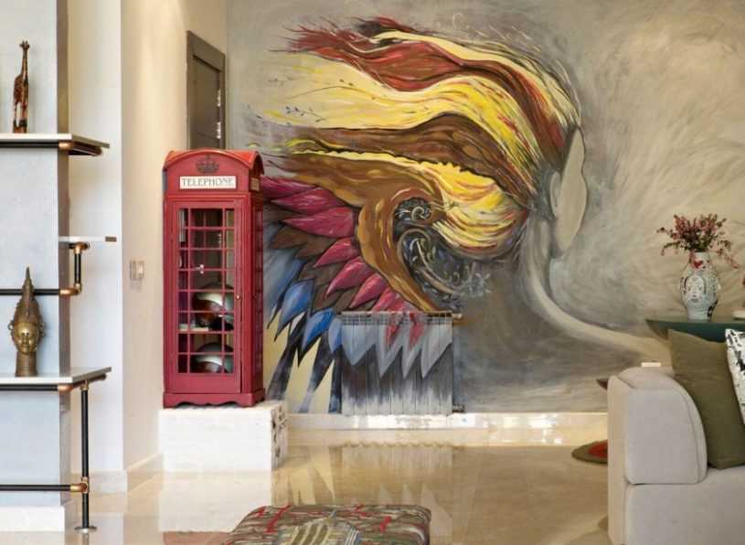 Благодаря широким возможностям краски такая роспись стен в интерьере может выглядеть совершенно по-разному: от пастельных пейзажей, напоминающих фрески, до кислотных граффити.