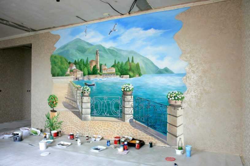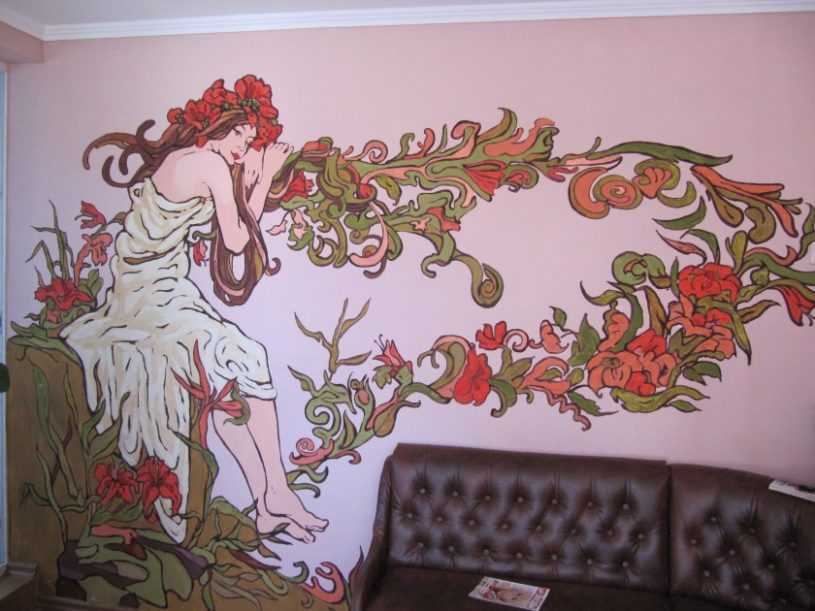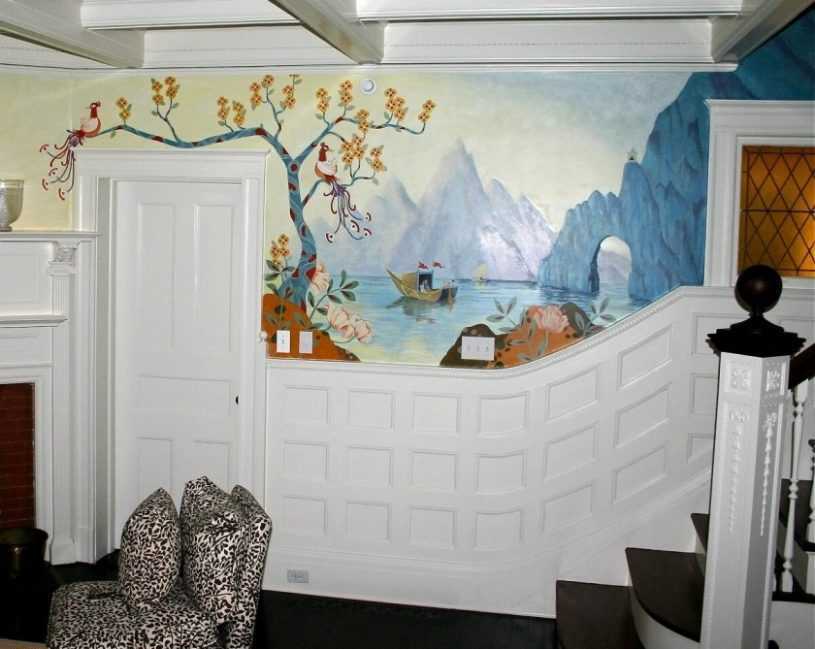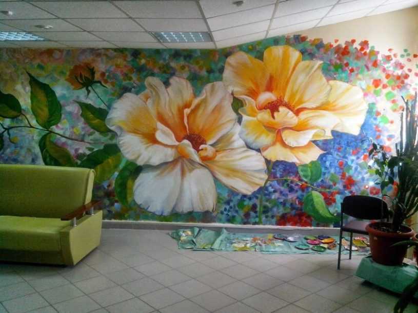 Эта простейшая технология переноса картины на стену, при которой понадобятся навыки и талант художника. Роспись можно заказать профессионалу, заранее ознакомившись с его работами. В этом случае можно будет выбрать наиболее подходящий эскиз и даже вносить изменения в процессе работы.