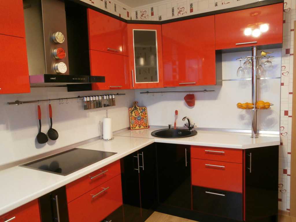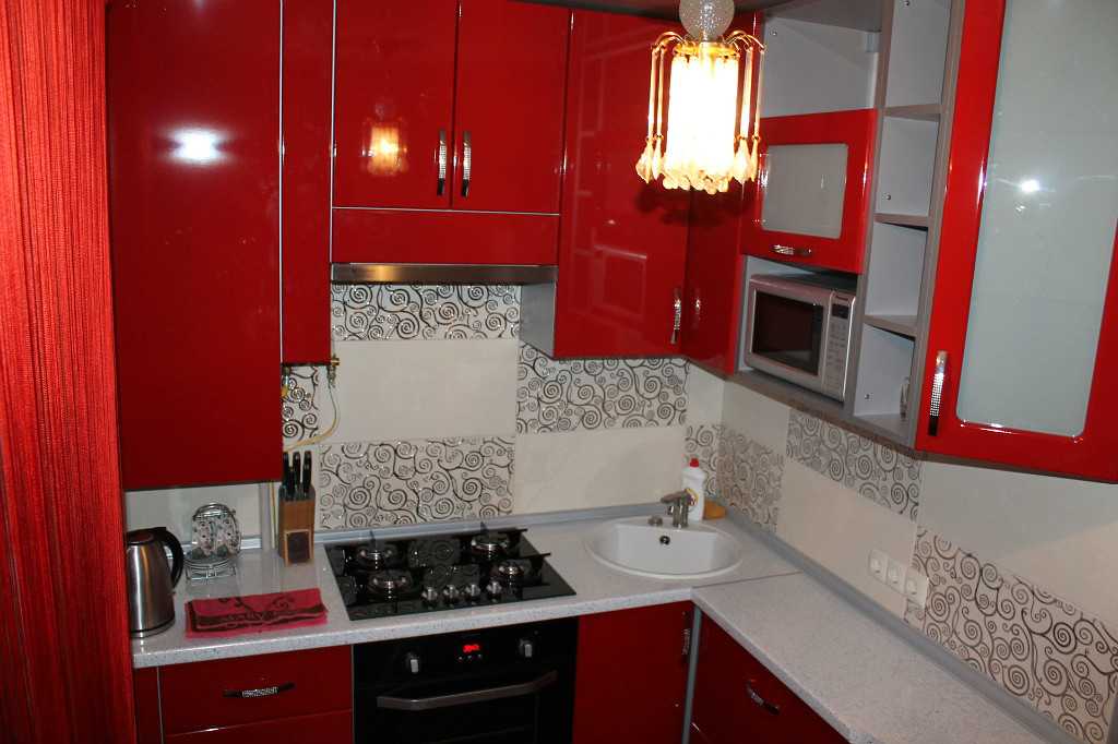 Для маленькой кухни хорошо подойдёт тёмный глянцевый гарнитур-трансформер, позволяющий разгрузить пространство и компактно хранить утварь.