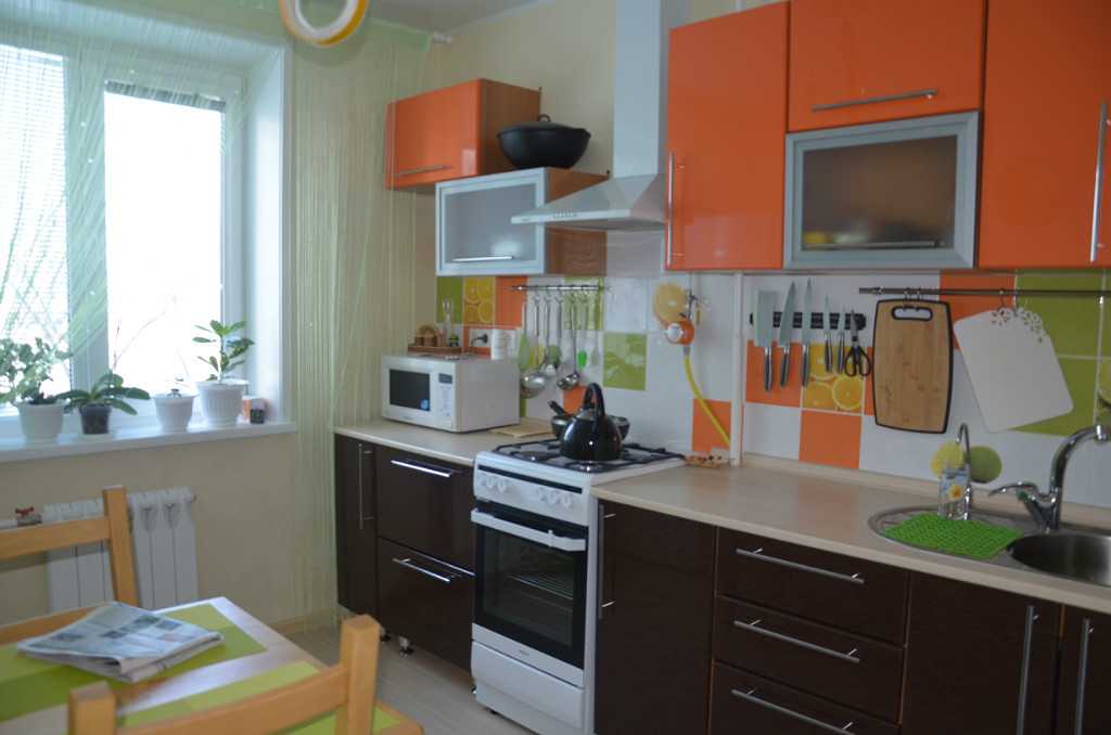 Столешница может быть оформлена в тон фасадам, светлой или яркой. Если кухня малогабаритная, лучше не делать столешницу тёмной — большее число светлых поверхностей поможет нивелировать эффект уменьшения пространства.