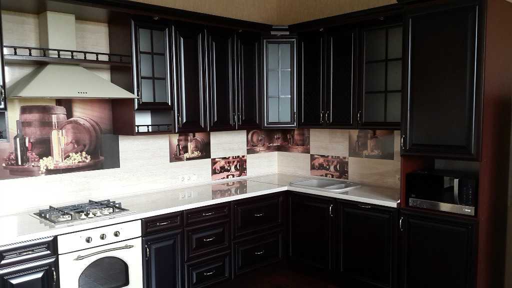 Для тёмного гарнитура отделку стен подбирают сходную по цветовой температуре (холодную или тёплую). Наиболее выразительно гарнитур смотрится на фоне светлых стен – бежевых, белых или цвета слоновой кости.