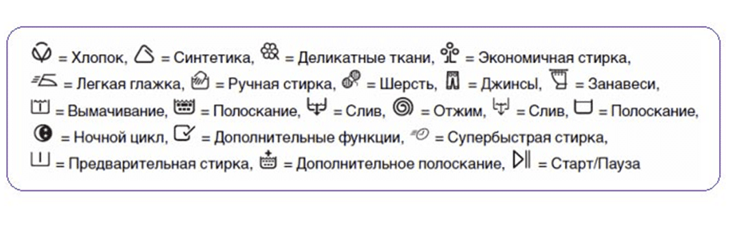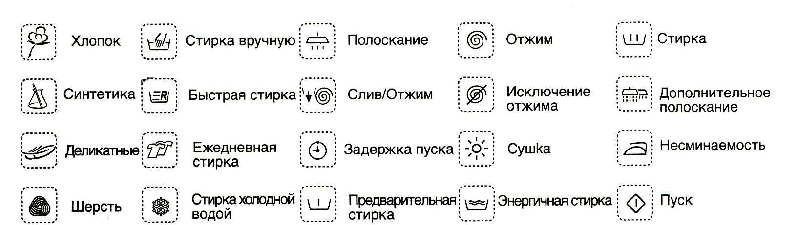 Другие многочисленные режимы являются лишь вариациями этих четырех основных категорий. Также стоит отметить существование режимов, которые позволяют предотвращать сминание вещей во время стирки.