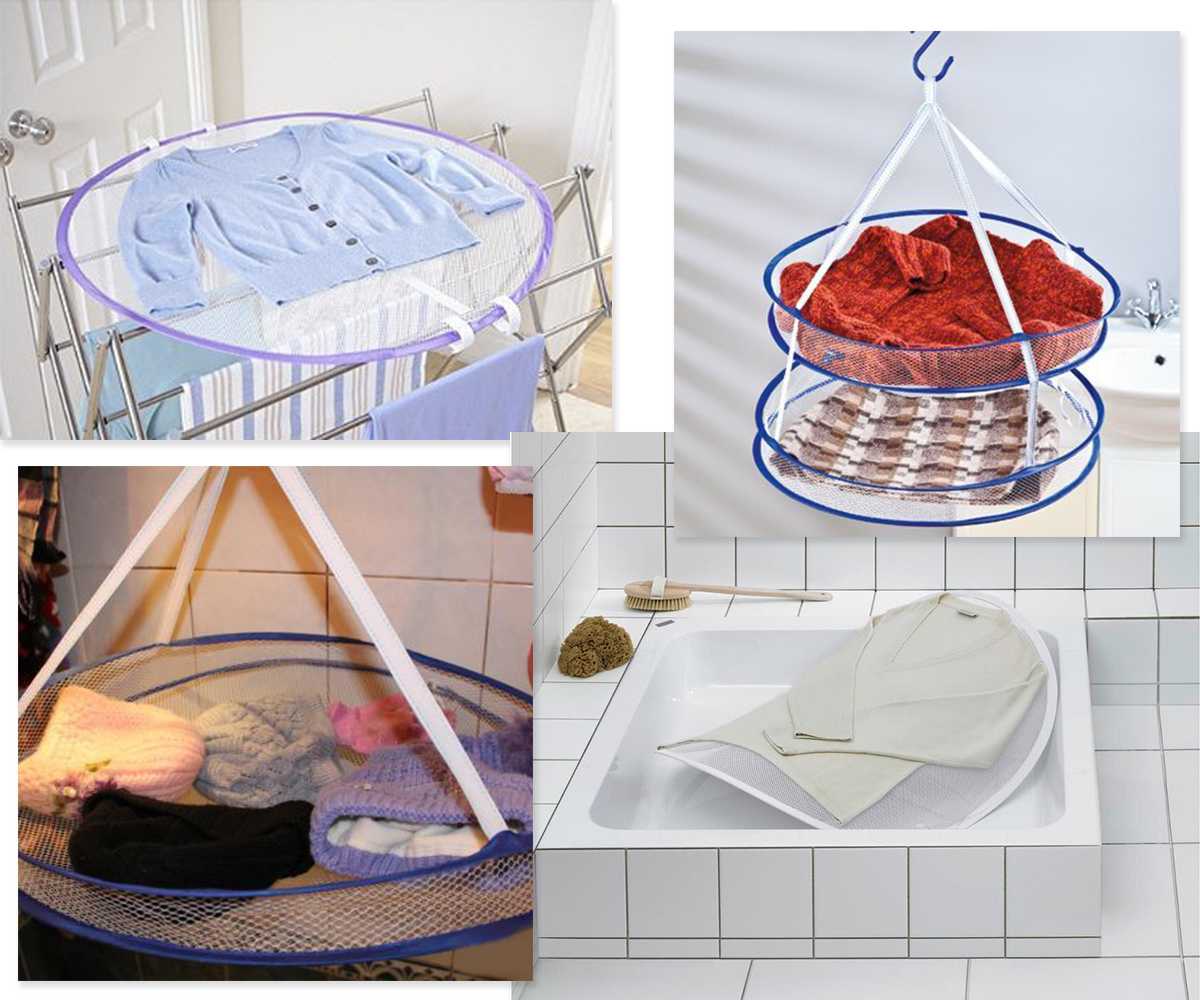В продаже есть специальные сушилки для вязаных вещей, которые помогут сохранить форму изделий и сократить время сушки за счёт циркуляции воздуха с разных сторон