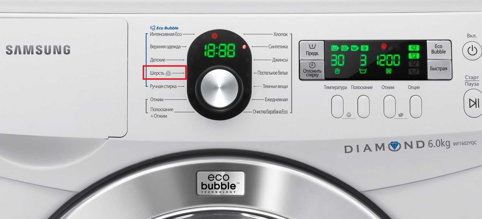 - Выбрать необходимый режим — «шерсть». Если его нет, то «деликатная стирка» или «ручная стирка».